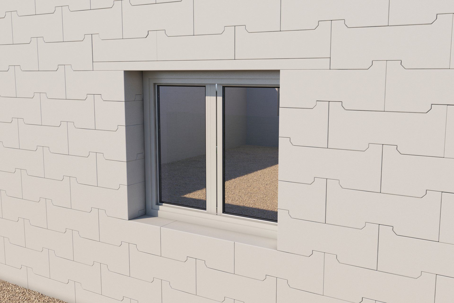 Das ganze Fensterelement aus Perlit, mit einem guten U-Wert von 0,198 W/m² K. ,mit den Abmessungen von 704 x 352 x 250 mm und mit „Nut- Feder" sowie einer glatten Oberseite. Diese Steine werden benötigt um das Fenster optimal einzubauen und zu befestigen (schrauben und schäumen)